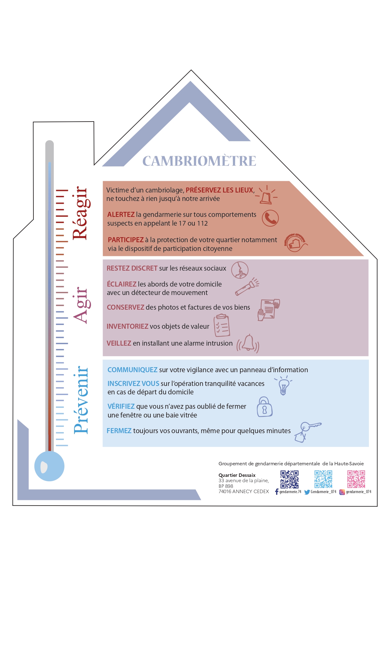 Lancé en 2023 par la Gendarmerie de la Haute-Savoie, le cambriomètre est un outil qui permet de lutter contre les cambriolages en diffusant au plus grand nombre des mesures simples à mettre en place : prévenir, agir, réagir.